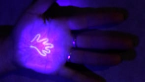 Fluorescent orange pigment frozen in ice, painted canvas and UV light